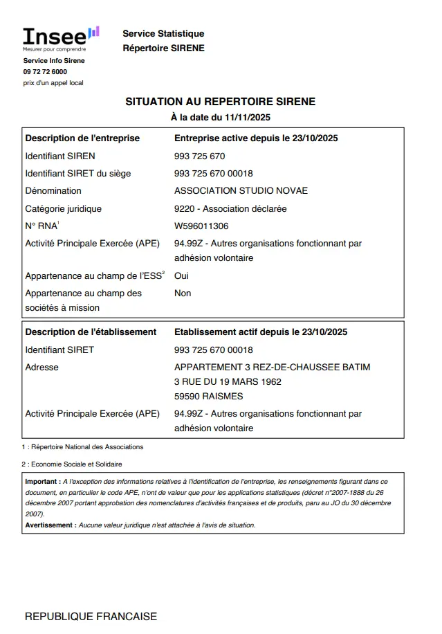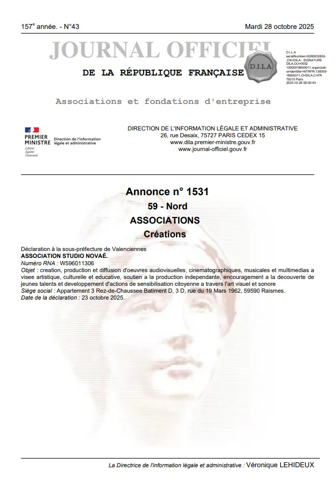 Studio Novaé est une association de production audiovisuelleloi 1901 fondée le 23 octobre 2025 à Raismes par Maxime Skorupka(Président) et Véronique Skorupka(Trésorière), dans le nord de la France.